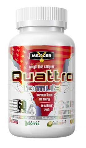 Легкая, но при этом весьма эффективная формула для поддержки общего тонуса, в период диеты и изнуряющих нагрузок. - содержит смесь 4-х эффективных ингредиентов - улучшает концентрацию - восполняет энергию мышц после тренировок Компания Maxler объединила силу четырех самых популярных ингредиентов для похудения в одной мощной эффективной формуле для достижения быстрых результатов! Экстракт зерен зеленого кофе оказывает мощное ингибирующее действие на высвобождение глюкозы в организм, одновременно, ускоряя метаболизм,что в свою очередь способствует сжиганию жира. Кетон малины стимулирует секрецию гормона адипонектина. Он ускоряет метаболизм и участвует в расщеплении жиров. Экстракт листьев шелковицы снижает уровень сахара в крови после еды и помогает снизить риск развития диабета. Гарциния камбоджийская помогает сжигать жир, предотвращает его отложение, и уменьшает аппетит. Quattro Formula способствует снижению веса, повышению умственной активности, концентрации внимания и сохранению энергии во время интенсивных физических нагрузок!